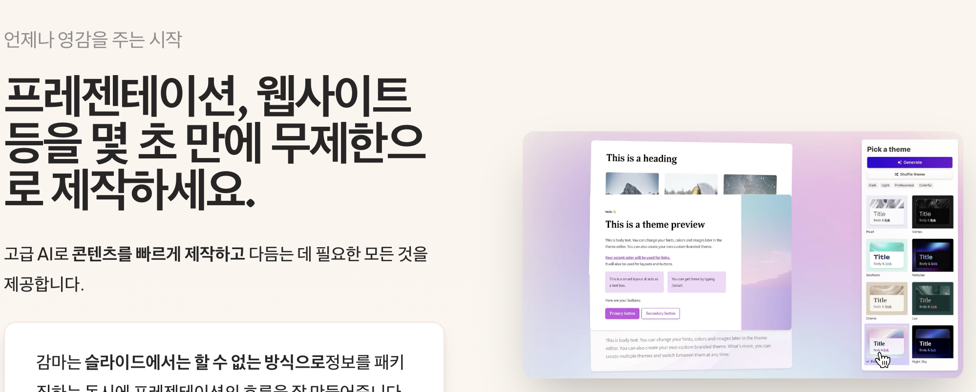 - 텍스트/프롬프트/파일/URL 기반 프레젠테이션 생성
