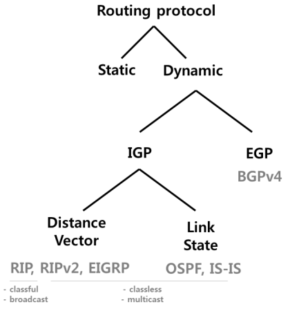 라우팅 프로토콜은 크게 AS 내부/외부 중 어디에서 수행되는지에 따라 종류를 나눌 수 있다.