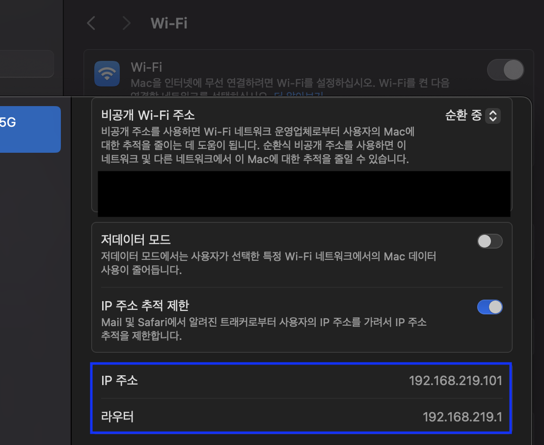 현재 와이파이에 연결된 상태라 IP 주소는 사설 IP로 되어 있다.