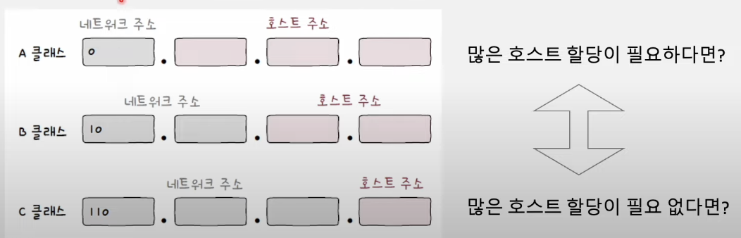 | 주소 특징 | 4바이트 = 32비트 점(.)으로 구분 8비트 4개 그룹, 10진수로 표기 클래스 단위로 비순차적 할당(비효율) |