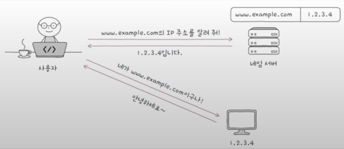 도메인 네임과 IP 주소는 네임서버 Name server 에서 관리한다. DNS 서버라고도 부르는데, 인터넷 세계의 공용 전화번호부 같은 개념이라고 보면 된다. 아래 그림처럼, 도메인 네임을 네임 서버에 질의하면 해당 도메인 네임에 대한 IP 주소를 알려주는 방식으로 동작한다.
