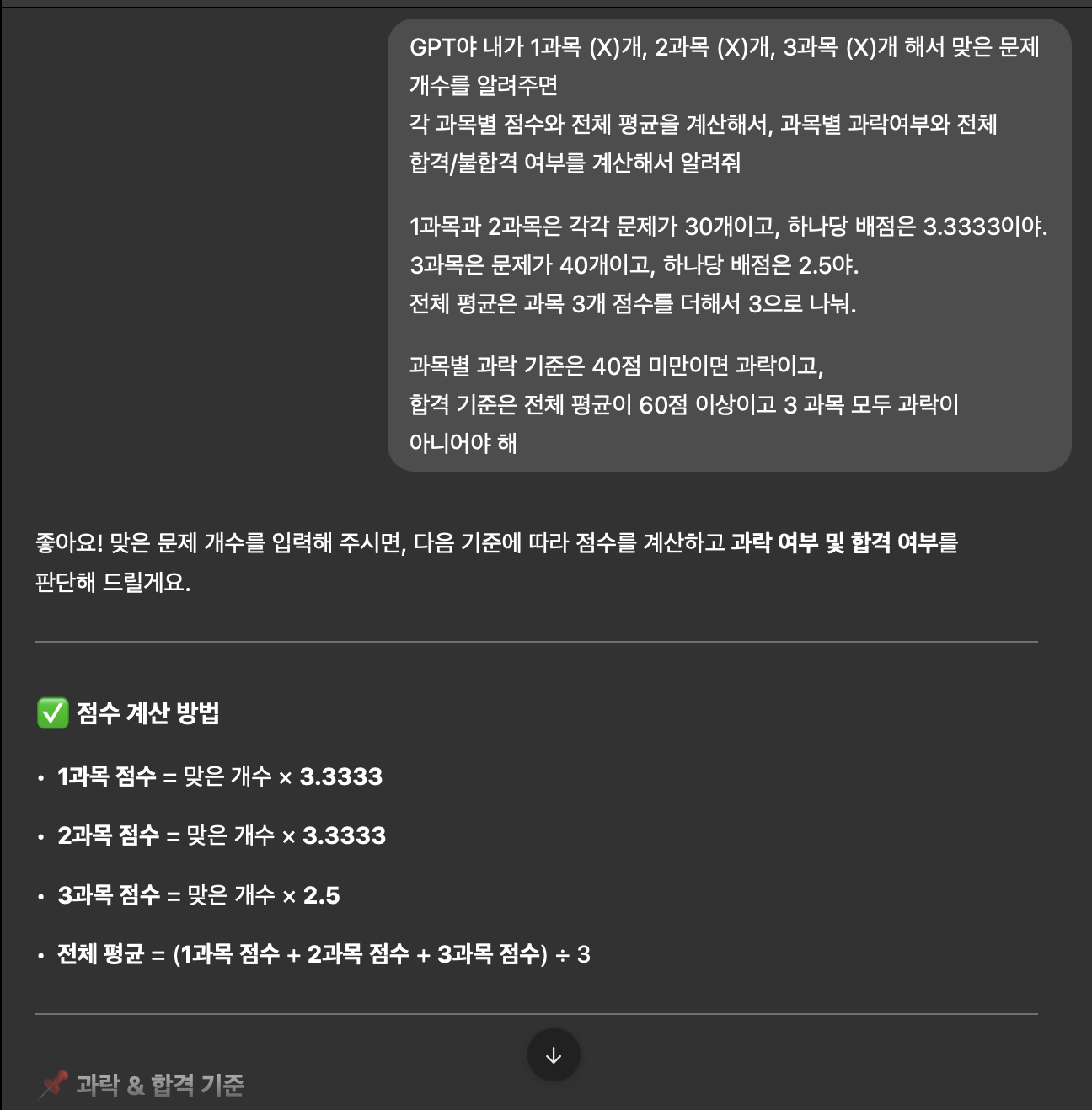 GPT야 내가 1과목 ___개, 2과목 ____개, 3과목 ___개 해서 맞은 문제 개수를 알려주면