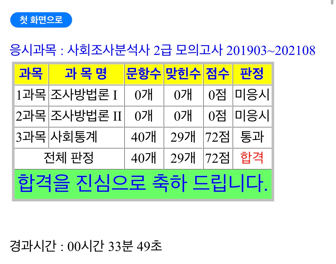 시스템상 가채점 결과가 70점이니까 합격이겠지^^