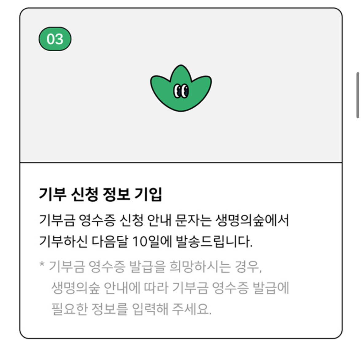 기부금 영수증이 필요하다면 나중에 생명의 숲에서 보내는 안내 문자를 참고하면 되고,