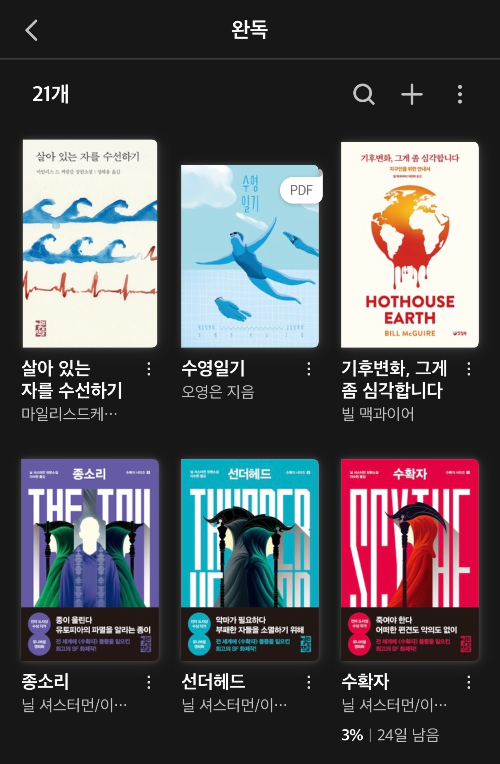 밀리의 서재는 책장을 여러 개 만들 수 있어서, 헷갈리지 않고자 완독 책장을 만들어서 사용했었다.