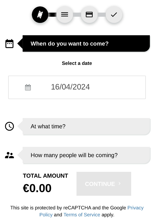 티켓 유형을 다 골랐다면 다음과 같은 화면을 만나게 됩니다. 입장 날짜와 시간을 고르는 화면이에요.