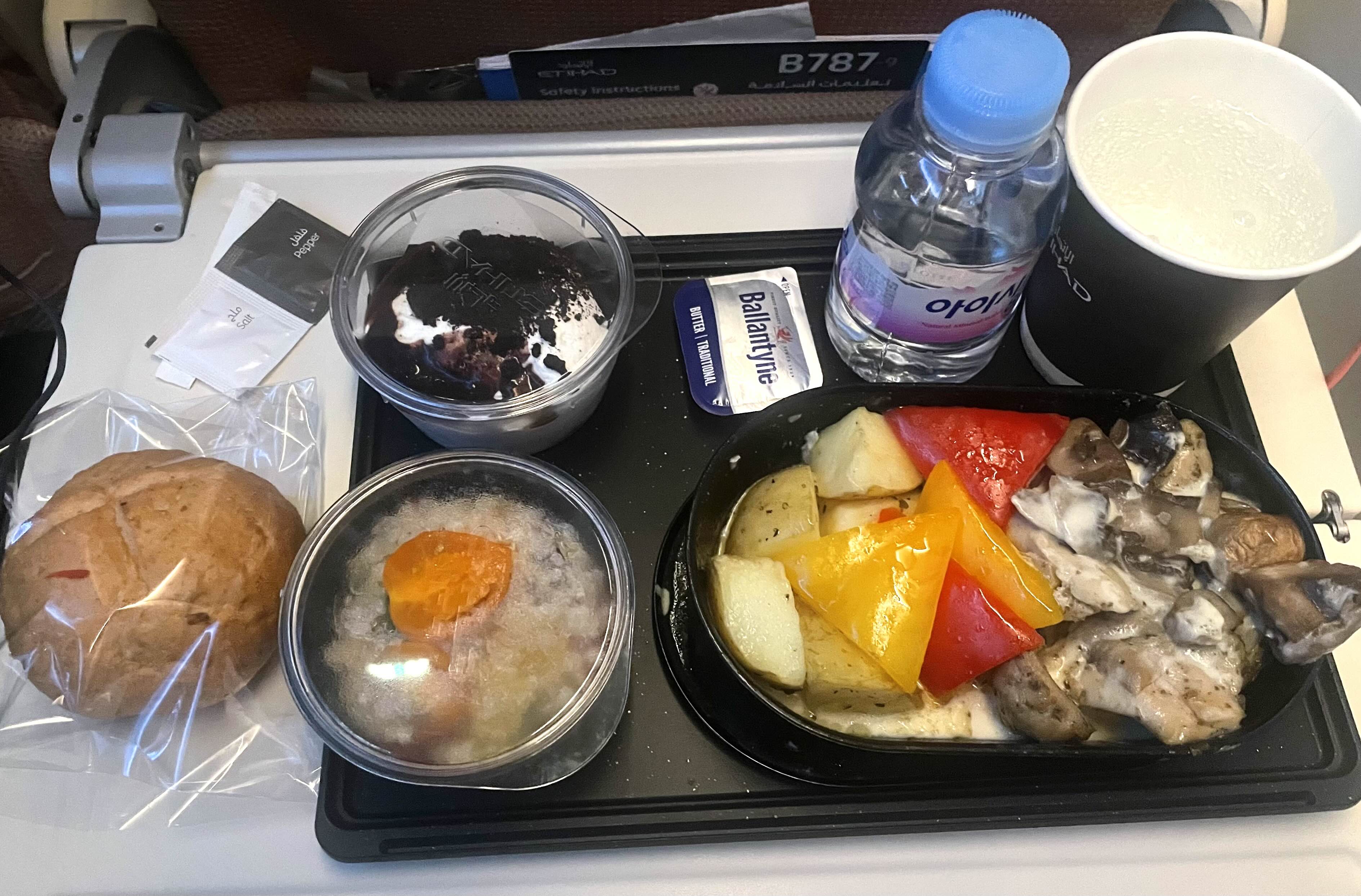 두 번째 기내식도 어쩌다 보니 치킨^^를 골랐다. 버섯+치킨에 감자 조합이었는데 조금 느끼했다.