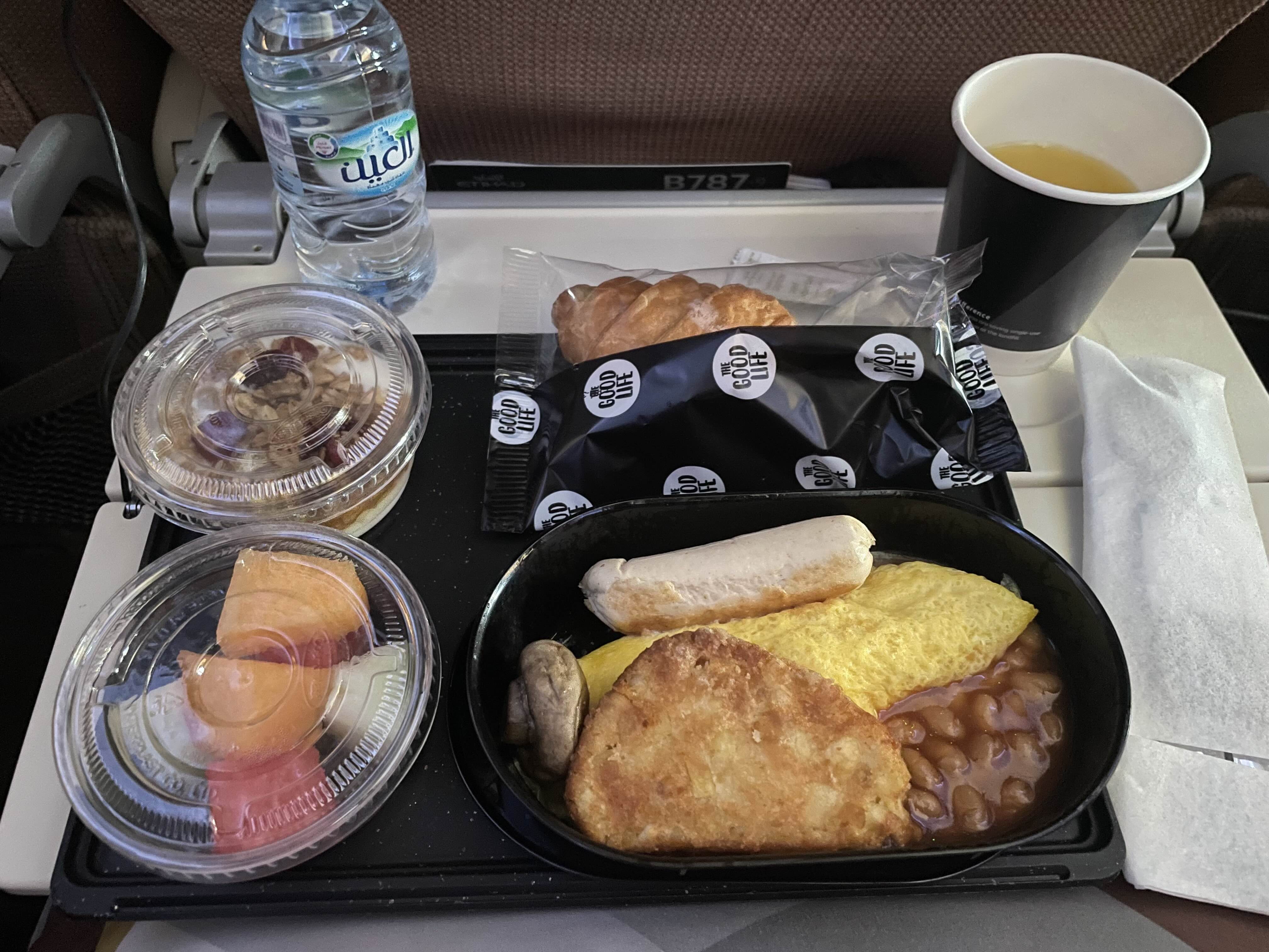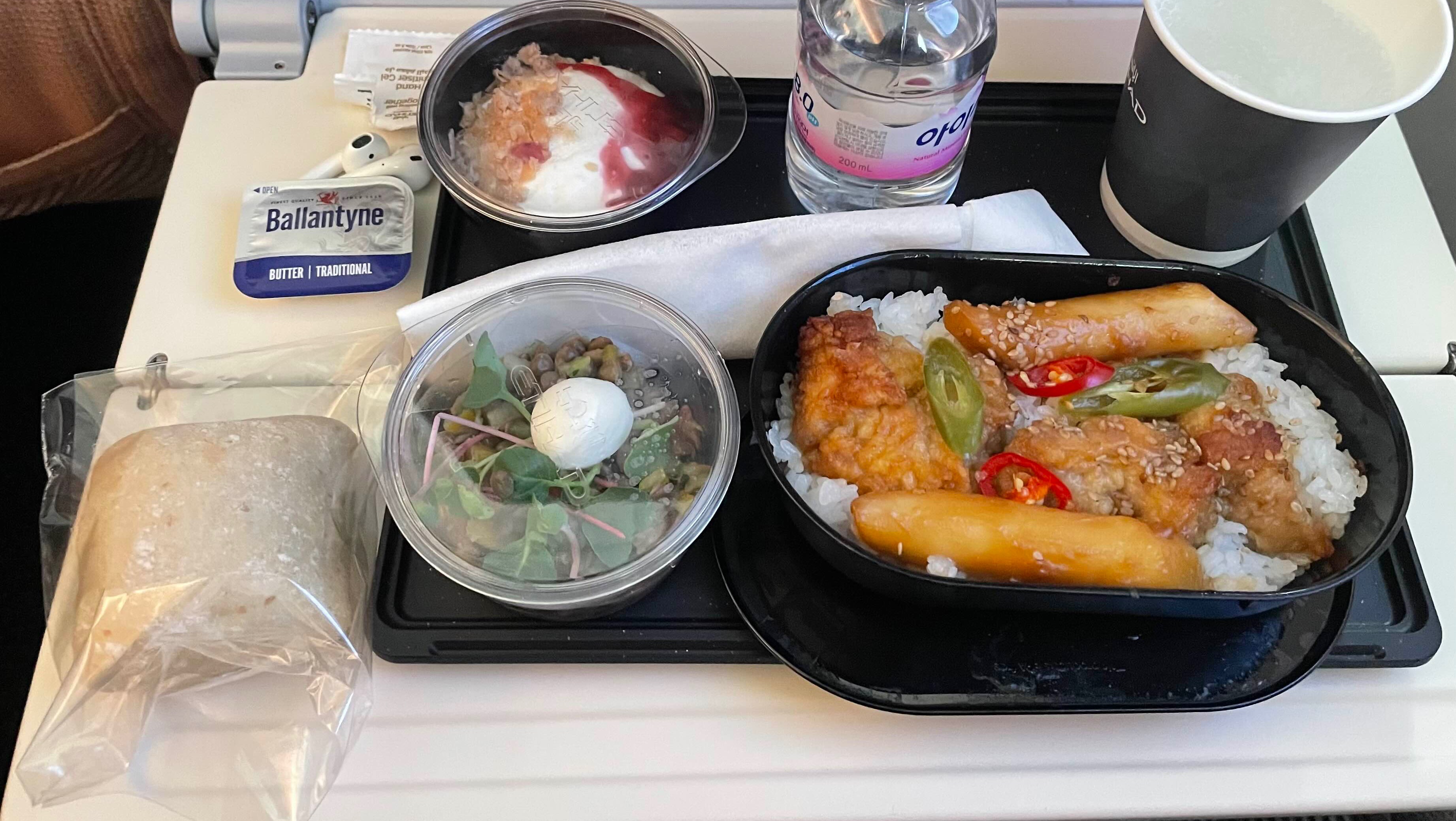 이번엔 찐 요거트에 견과류랑 꿀 비슷한 게 뿌려져 있었는데 내 서타일은 아니었다. 원래 딸기잼도 줘야 하는데 승무원이 떨구고 다시 안 가져다줬다.