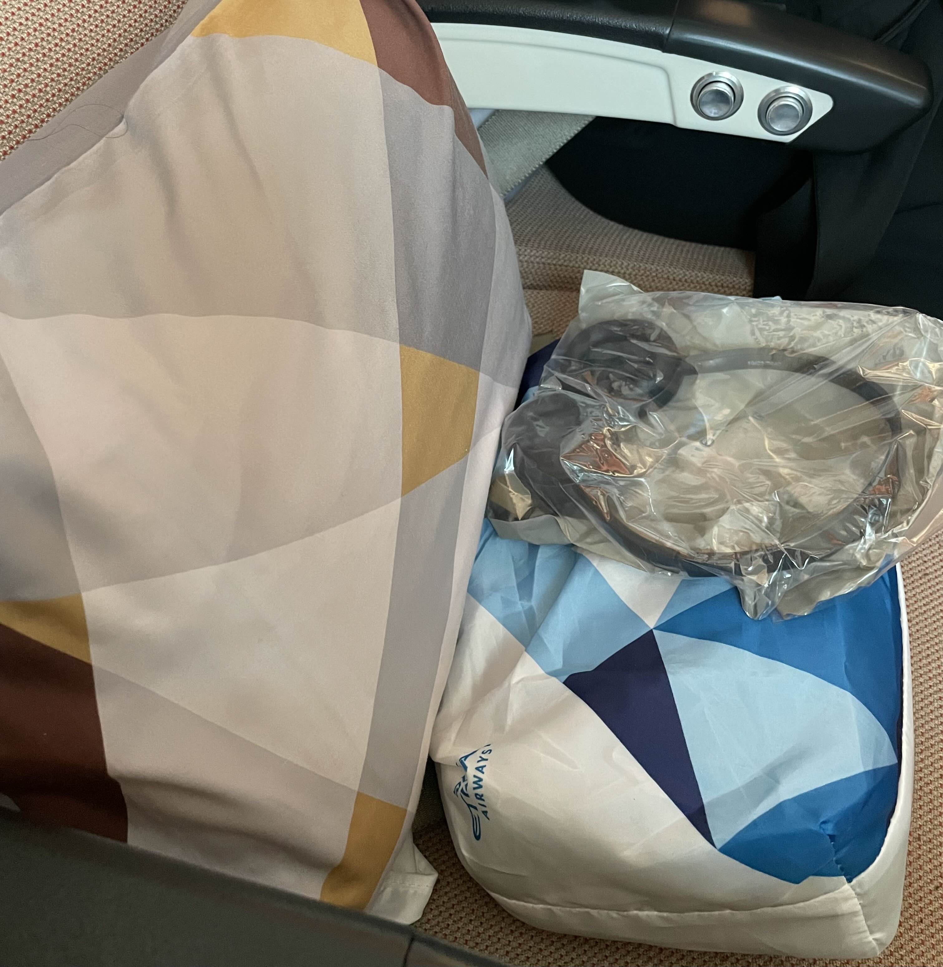 아부다비행 비행기 어메니티는 쿠션 헤드셋 그리고 에코백 안에 있는 것들(하단 사진)