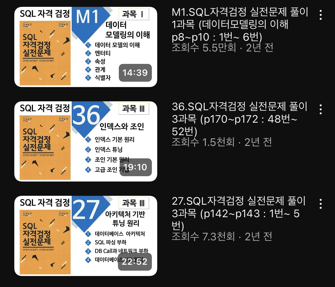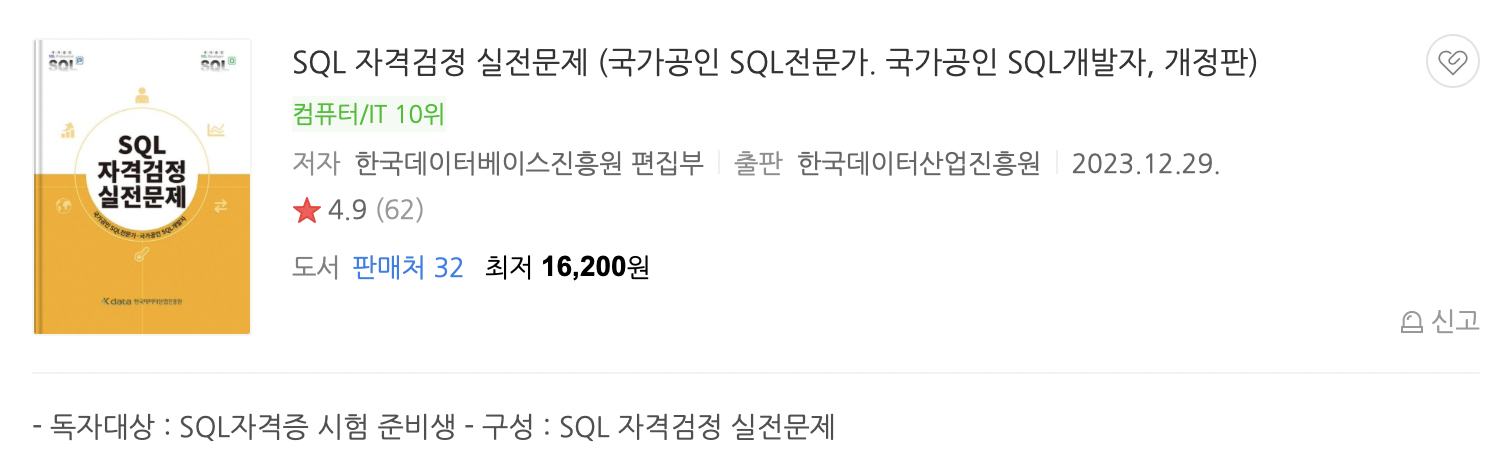 그리고 문제풀이 교재는 모두가 다 아는 노랭이책, SQL 자격검정 실전문제로 선택했습니다.