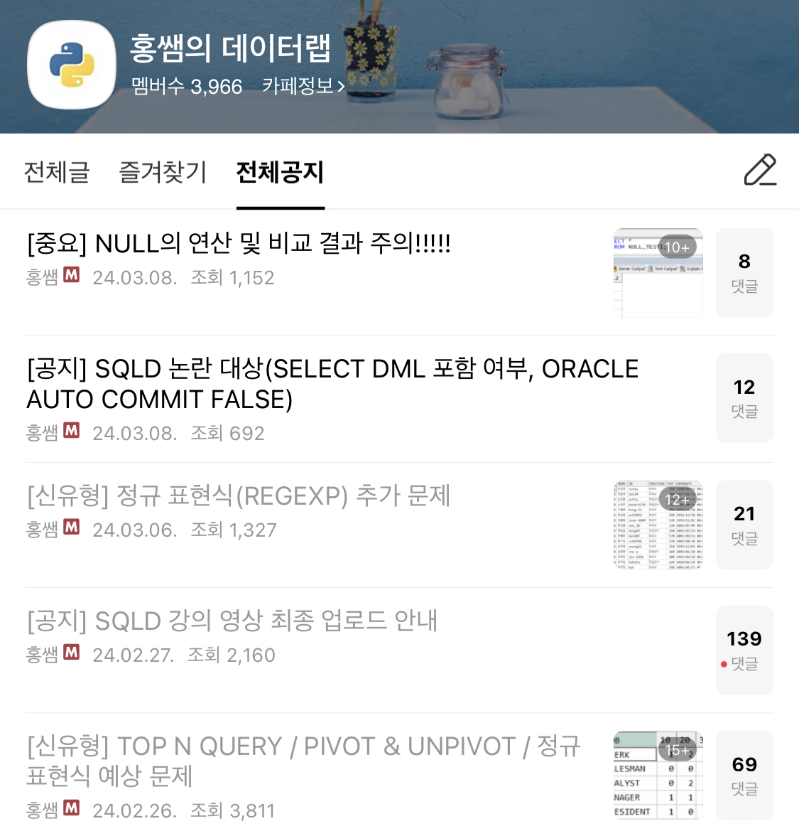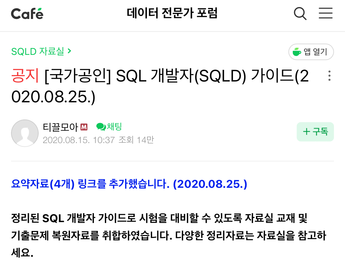 이론/개념 교재는 네이버 카페 "데이터 전문가 포럼"에서 다운로드하실 수 있는 SQL 개발자(SQLD) 가이드 파일입니다.