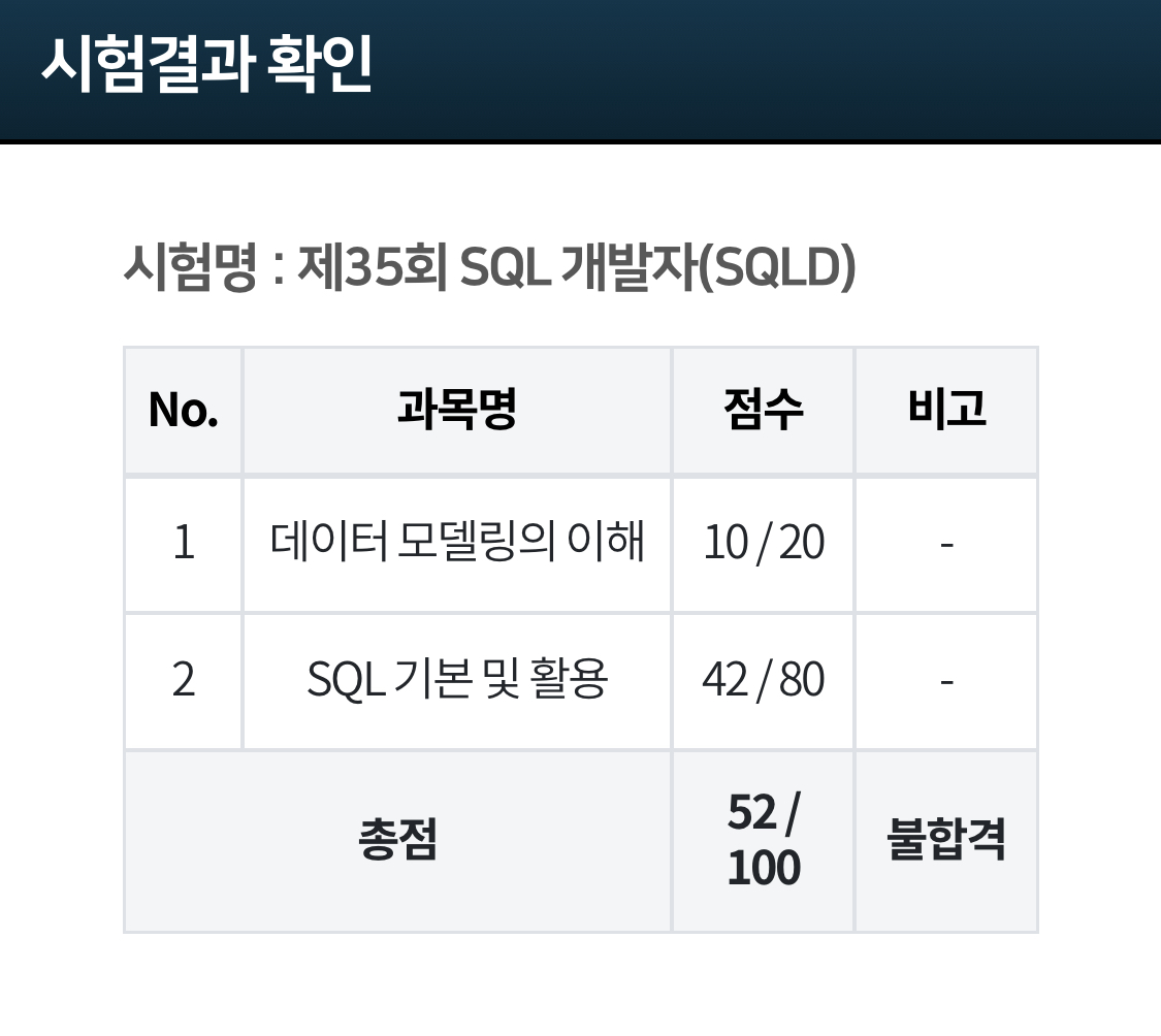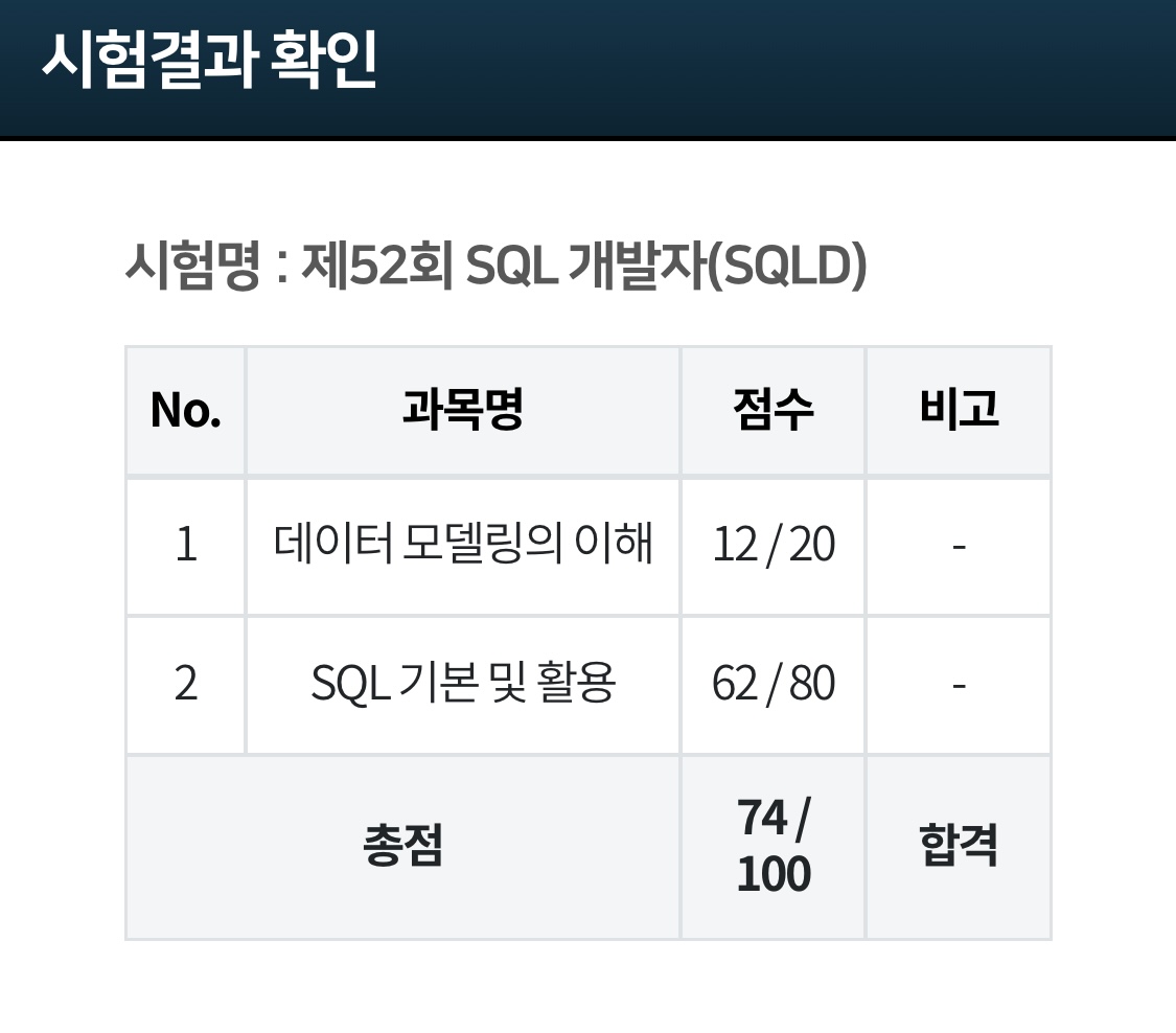 조금 전 4시경 제52회 SQL 개발자 자격시험, 일명 SQLD의 사전 점수가 공개되었습니다.