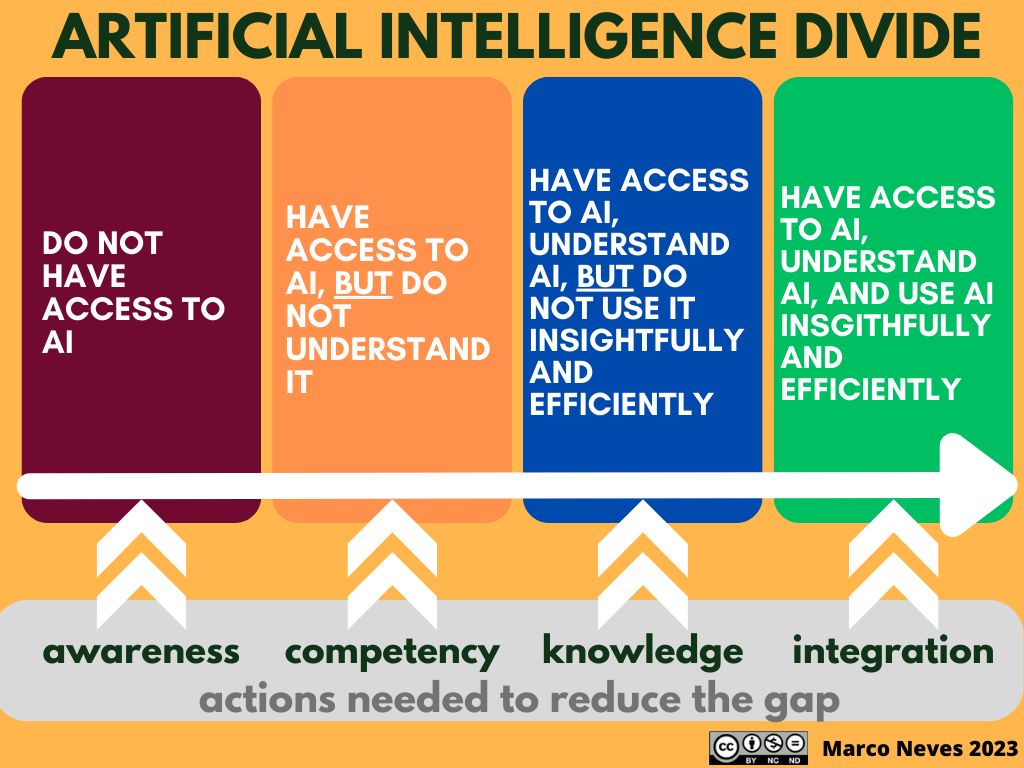 AI 디바이드란 “AI를 효과적으로 사용할 수 있는 사람과 그렇지 못한 사람 간의 격차”를 의미함. AI 교육 전문가 마르코 누베즈에 따르면, AI 디바이드에는 총 4개 수준이 존재