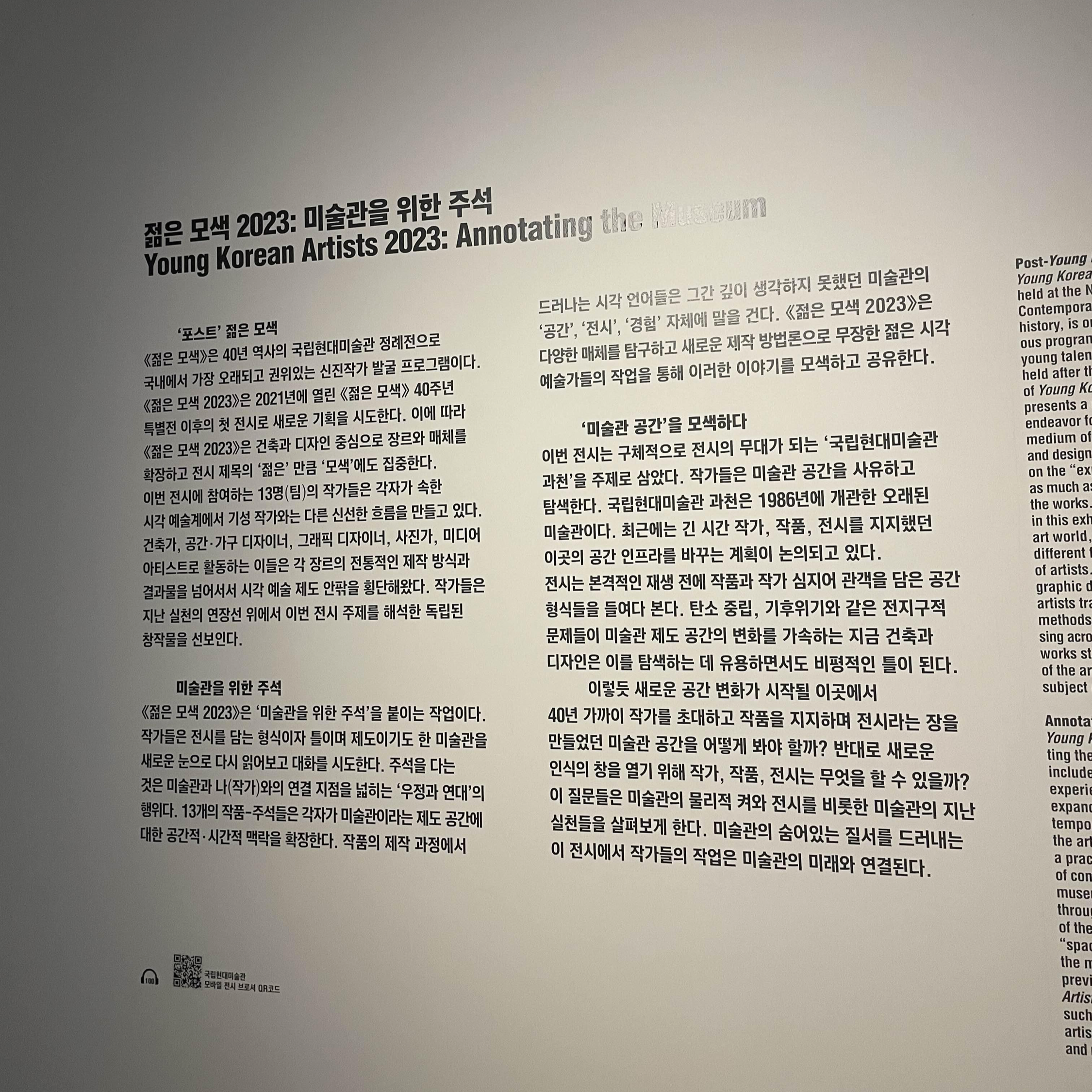 계속해서 이어지는 국립현대미술관 정례 기획전시 <젊은 모색 2023: 미술관을 위한 주석> 후기이다. 앞선 포스트에서도 설명했지만 다시 짚고 넘어가자면, <젊은 모색>은 국현미에서 격년제로 주최하는 신인작가 발굴 프로그램이다. 1981년 <청년작가>전을 시작으로 해서 1990년 개칭된 이후로 현재까지 40년 넘는 역사를 가진 오래되고 그만큼 권위 있는 전시이다.