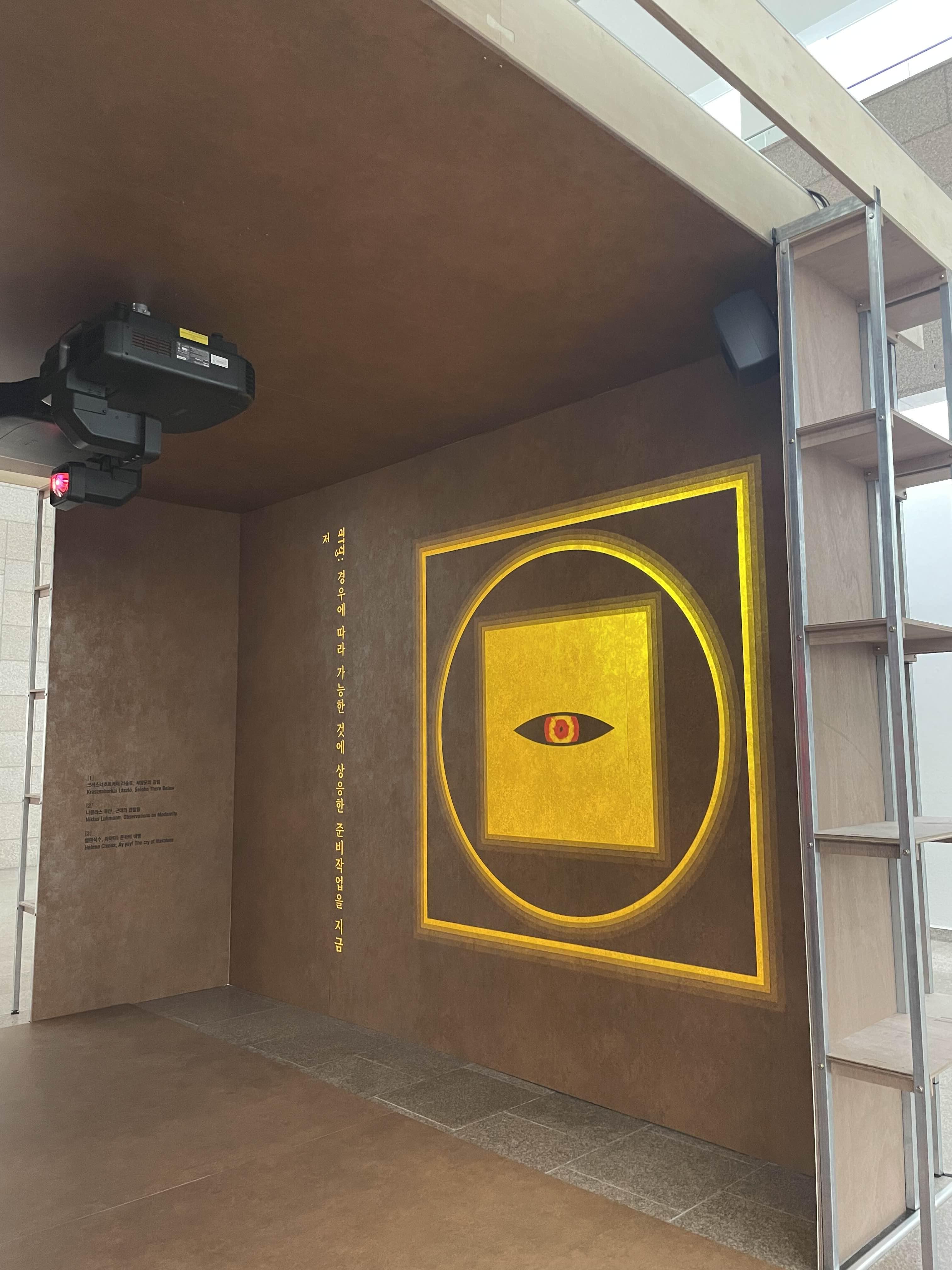 맞은 편의 영상보기. 영상이 계속해서 변해서 양쪽을 번갈아 보느라 바빠지더라. 그래서 전시 다 보고 다시 돌아와서 넋 놓고 다시 보기를 오히려 추천한다. 사실 영상에서 가장 마음에 드는 구절을 영상으로 찍어 두었는데, 지금 보니 그게 이 작품들의 총제였다.