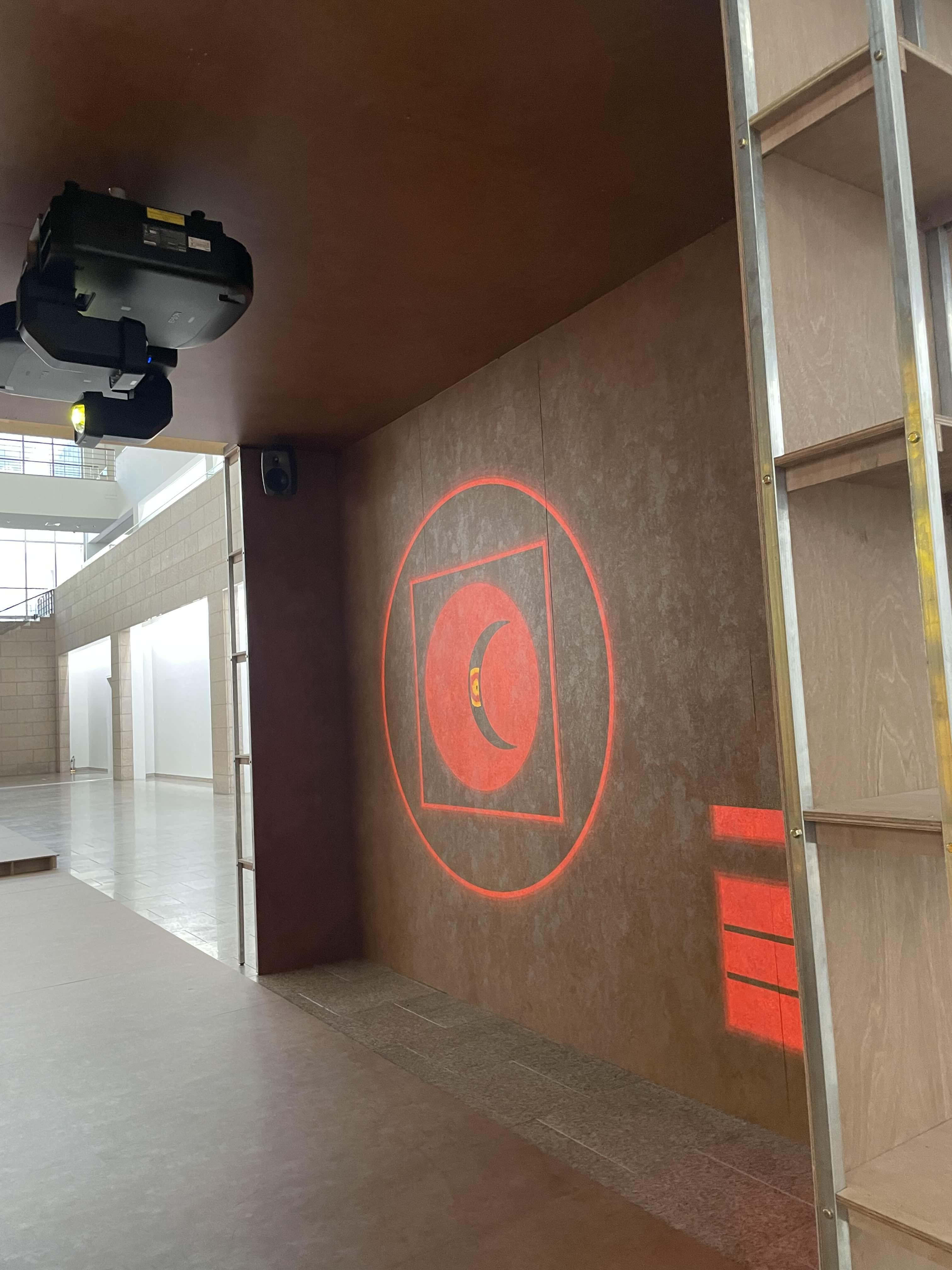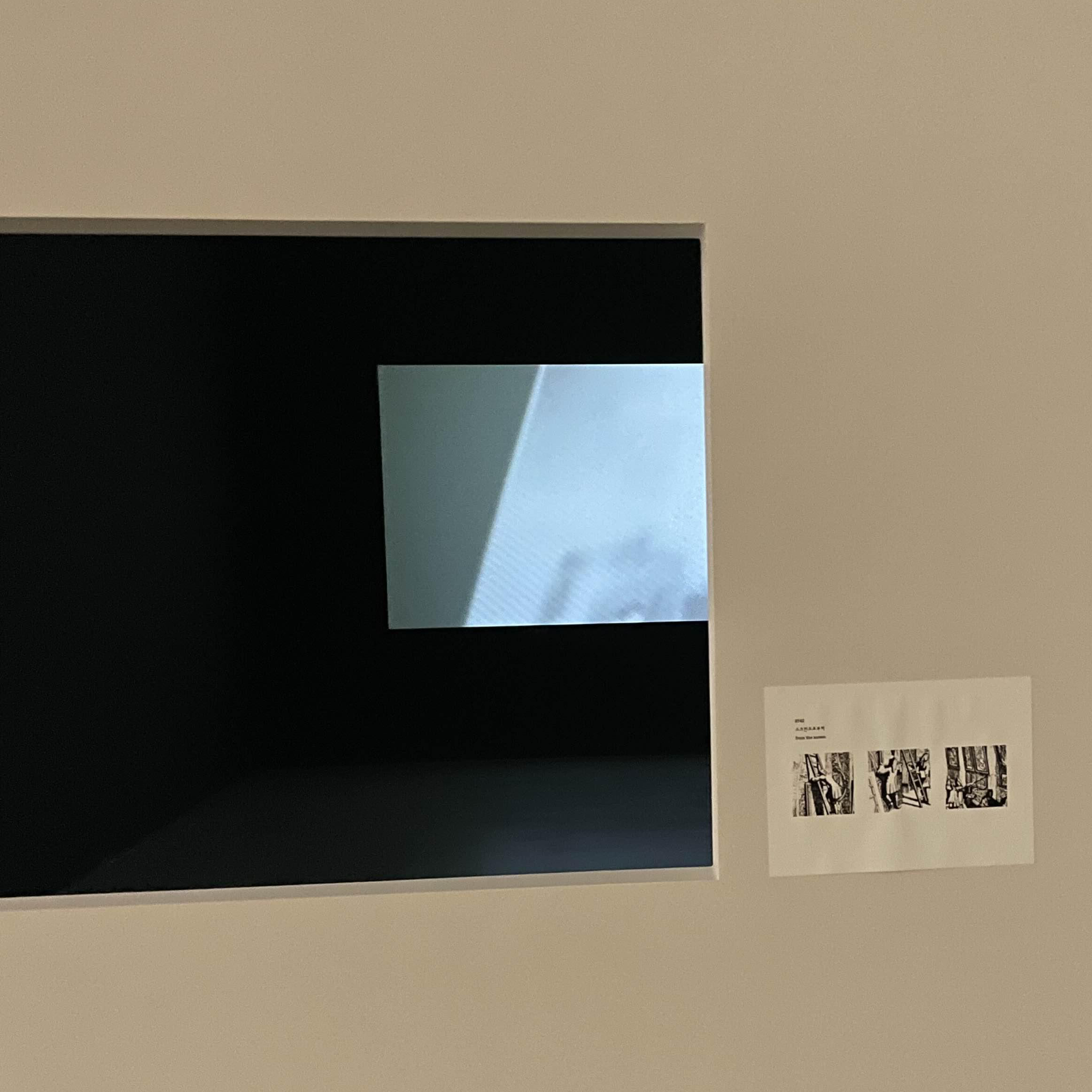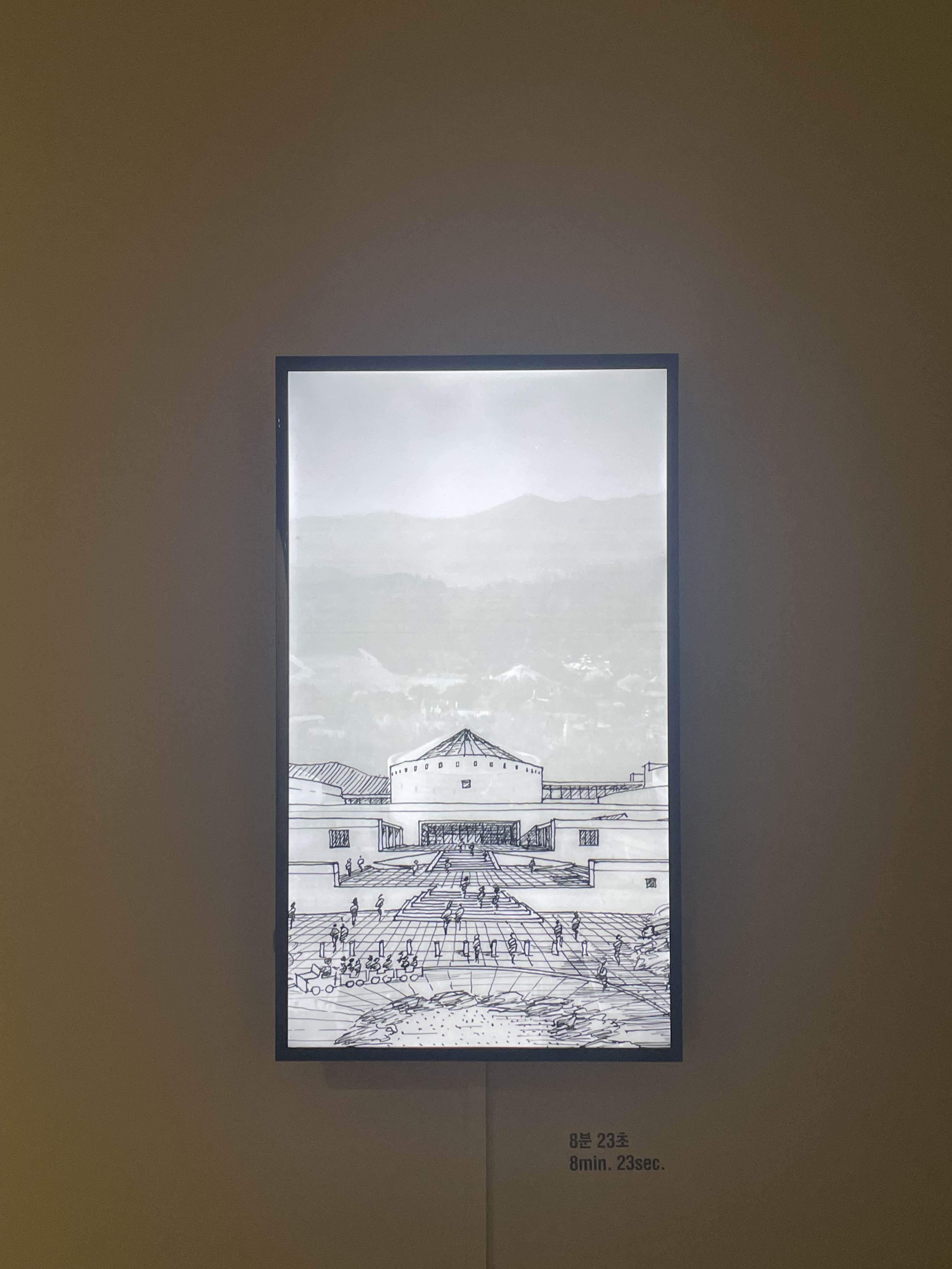 이렇게 중첩된 가벽 사이를 계속해서 걷게 된다. 그 끝에 벽을 꽉 채운 영상을 계속 틀어 놨다. 프레임 속 프레임 속 프레임이라 한 번 더 찍어봤다.